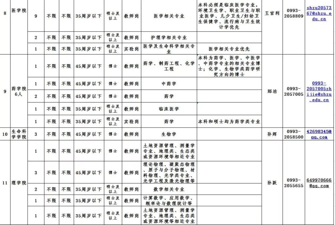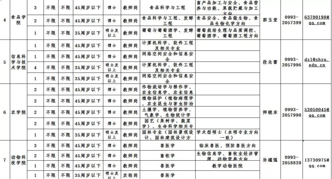 四、报考条件和招聘对象(一)报考条件1、遵守宪法和法律,坚决维护祖国统一和民族团结,反对民族分裂和非法宗教活动;未受到任何组织处理,具有良好的道德品行和正常履行职责的身体条件。2、热爱教育事业,愿为新疆、兵团事业贡献聪明才智,有强烈的责任感和奉献精神。3、 符合招聘岗位年龄要求。博士学历人员年龄不超过45周岁(1974年10月1日及以后出生),硕士学历人员年龄不超过35周岁(1984年10月1日及以后出生),个别岗位年龄要求以招聘公告为准。4、应聘者应具备招聘岗位所公布的学历并取得相应学位;海外留学归国人员需取得国家教育部留学认证;少数民族中民考民或双语应聘人员须同时提供MHK四级乙等、普通话水平测试二级乙等及以上合格证书。(二)招聘对象1、符合招聘条件的内地高校和石河子大学、塔里木大学的应届、往届毕业生(应届生毕业时间截止为2020年7月31日)。2、专业及相关要求与招聘计划内容相符。3、具有博士学历且有高级职称者适当放宽条件,学校采取“一人一议”的方式考核聘用。(三)下列人员不得报考1、高校在读博士、本年度已考取国家统招博士及疆内公务员或事业单位在编人员不在此次招聘范围内。2、已在国家机关、国有企事业单位的在编在册正式工作人员,单位不同意与应聘人员解除人事关系(聘用合同关系)的。3、第一学历为成人教育、职业教育和民办教育的毕业生不在此次招聘范围内。4、曾因犯罪受过刑事处罚的人员和曾被开除公职的人员,以及法律规定不得聘用为事业单位的其他情形的人员。5、受到党纪政纪处分期限未满或者正在接受纪律审查的人员。6、处于刑事处罚期间或者正在接受司法调查尚未做出结论的人员。7、在公务员、事业单位招考中被认定有作弊行为且不得报考的人员。8、现役军人。9、法律、法规和有关政策规定的其他情形。