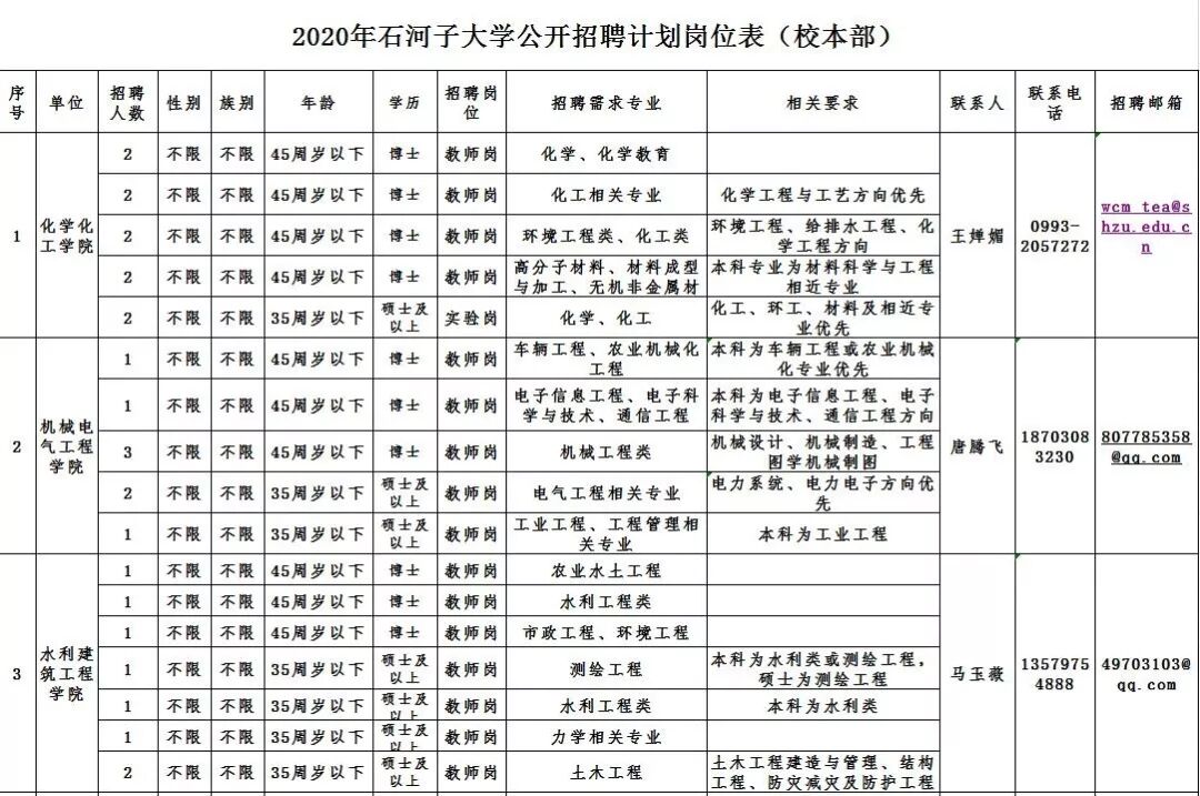 二、招聘计划及岗位详细岗位信息见《2020年石河子大学面向内地高校毕业生公开招聘计划岗位表点击获取》(附件1点击获取)。