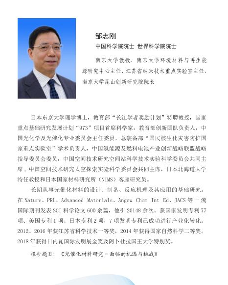 中国科学院院士、世界科学院院士、南京大学教授、南京大学环境材料与再生能源研究中心主任、江苏省纳米技术重点实验室主任、南京大学昆山创新研究院院长邹志刚作报告