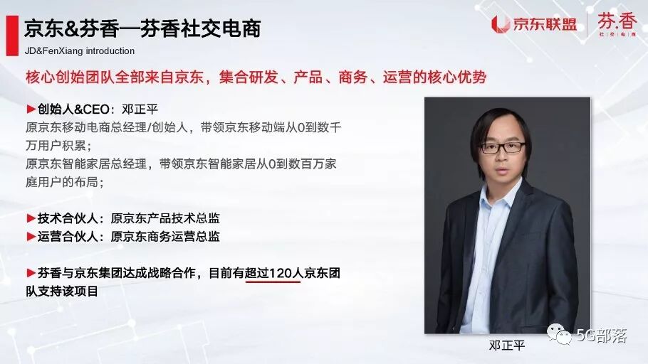 我刚刚发了一些资料,大家可以看一下第一张图,是我们京东芬香社交电商的创始人邓正平先生,他是京东的前100号员工,也是和刘强东刘总一起创业的老臣,长期担任京东移动电商总经理,我们现在平台的核心成员全部来自于京东。我们的技术力量非常的强大。