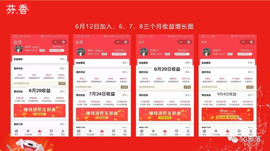 我是6月12号加入京东芬香社交电商,7月8号升导师,8月9号升合伙人,至今刚刚三个月,期间发展直属导师15位 ,间接导师30多位 ,发展超级会员近15000人,团队总人数超过11万人,群覆盖人群近300万人 ,我的日收入近几天破万元 ,月收入30万不再是梦!!!