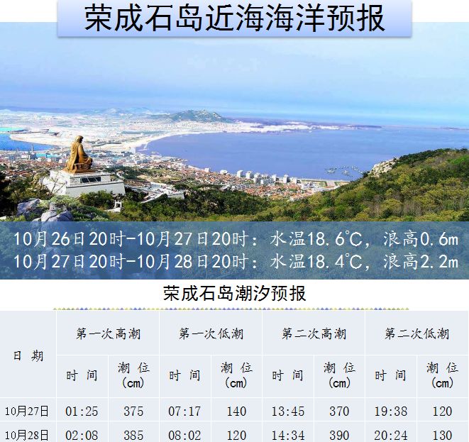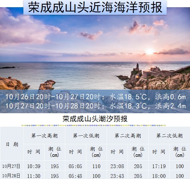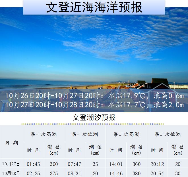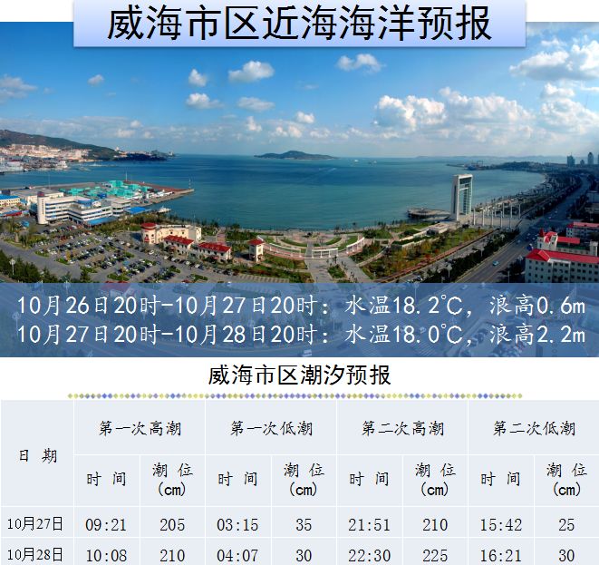 10月26日,威海市海洋与渔业监测减灾中心发布全市近海环境预报。预计今日夜间至明日夜间,市区近海有0.6米的轻浪;文登近海有0.6米的轻浪;荣成近海有0.6米的轻浪;乳山近海有0.6米的轻浪。