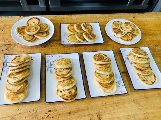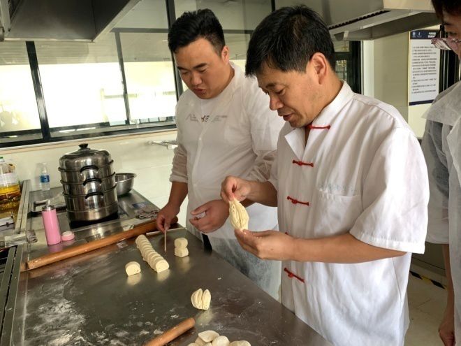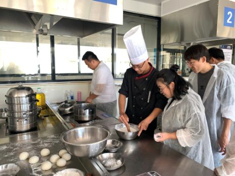 每天下午的实操课程主要由面点高级技师丛培柱老师传授。丛老师教学方法灵活,不拘一格,把理论和实操融合在一起,开展研讨式学习。实操课中讲解细致,手把手教学员动手做,反复示范。学员们不但学会了制作各式面点,还通过培训,学会了合作,懂得了自律。