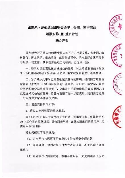 昨天晚上6点半,@行星文化PlanetCulture发表申明,公司负责承担歌迷购买张杰“未·LIVE”巡回演唱会金华、合肥、南宁三站的票款,售票网站将正式启动退票工作,票款将在10月28日起,5~10个工作日退回。