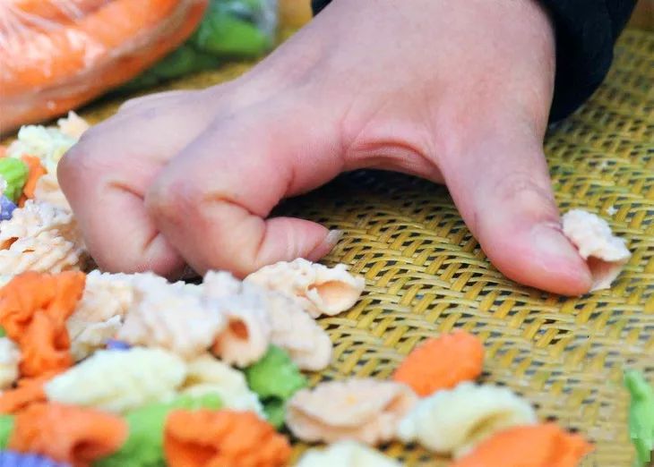 米筛爬是浦江的一道传统风味小吃。把面和虚后,搓成一指宽面条,然后扯下一小团,用大拇指在米筛上“爬”——摁,卷,再轻轻一拔就成。“米筛爬”做好后,不仅外形好看,口感还特别好,吃起来又韧又烂,别具风味。