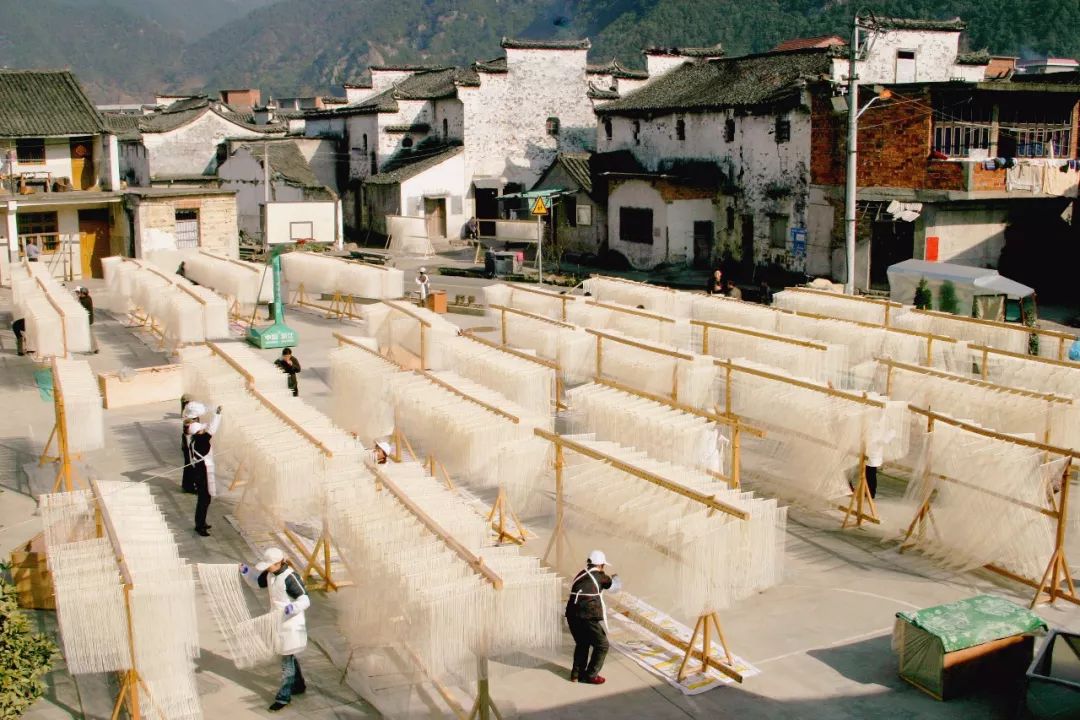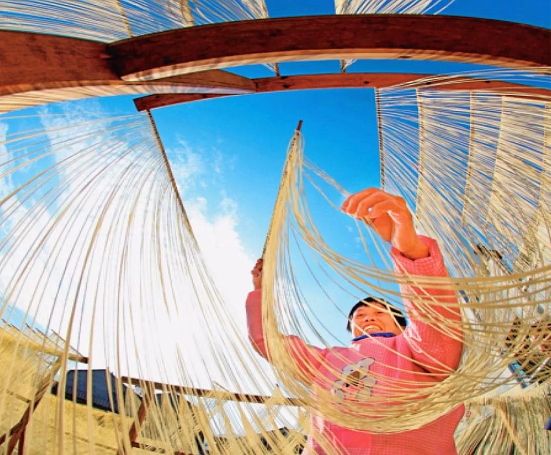 如果你能赶在每年11月到次年4月的开面节来一次潘周家村,这里成片成片面条海洋的画面更是会震撼得让你直接“哇”出声。500余户人家1600余口人,家家都会做面,天气晴朗时,每家每户都在晒场上支起面架,千万条白色的面线飞泻而下,线条感十足。