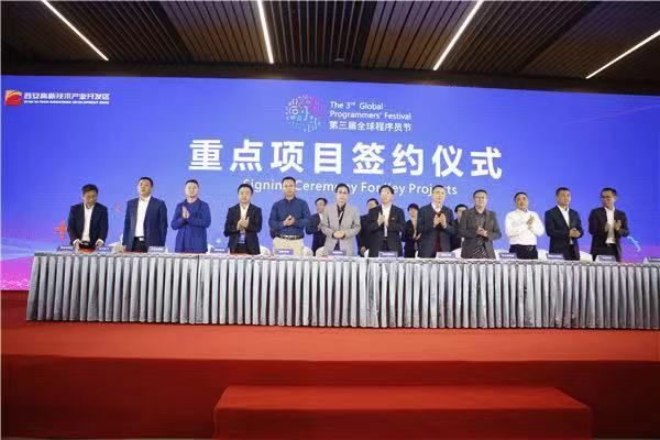 第三届“全球程序员节”重点项目集中签约仪式在高新区会议中心隆重举行。本次现场共签约28个重点项目,累计金额约147亿元人民币。其中,西安高新区与西安交通大学、西北工业大学、西安电子科技大学等十所高校机构在产学合作、人才输出及双创等领域签署全面战略合作协议,以及西安大学生青年职业发展促进联盟及HROOT的集中签约仪式备受关注。
