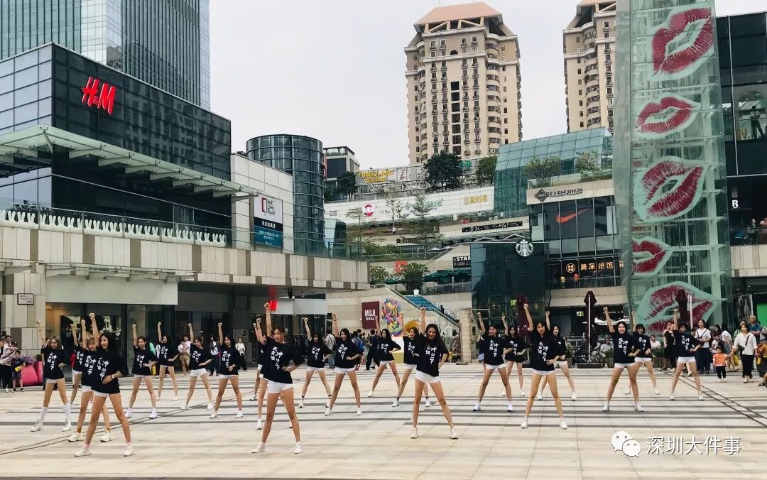 今天,在深圳核心商圈,三十位大长腿女神突然闪现!爆燃舞蹈炸裂全场,大字黑T衣服上整齐划一的“吃完饭,冲动一下?!”