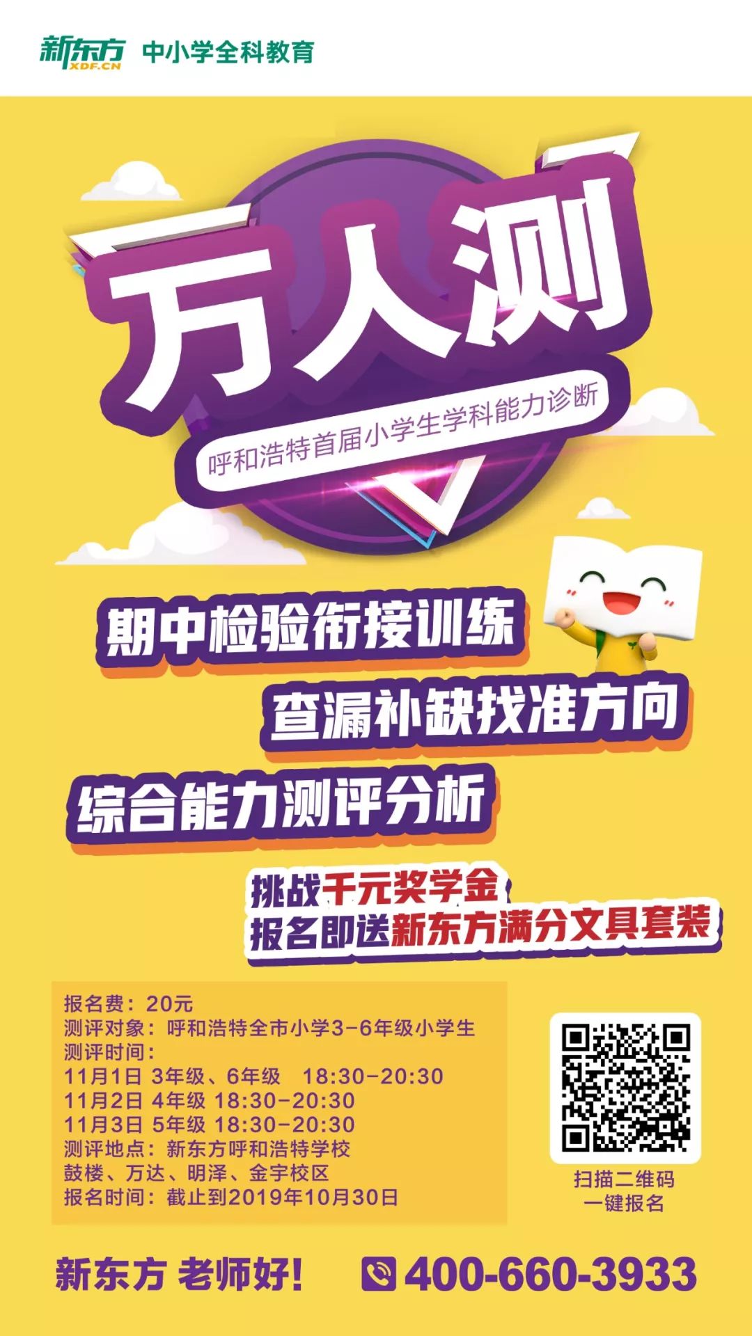 “万人测”是由新东方呼和浩特学校举办的针对呼和浩特市小学生开展的全科综合能力测评。