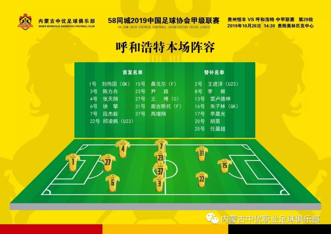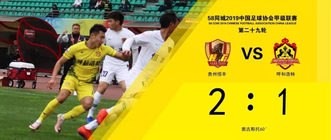 10月26日14:30,中甲联赛第二十九轮在贵阳奥体中心打响,呼和浩特客场挑战贵州队。上半场客场作战的呼和浩特并未得到太多的优势,补时阶段对方抓住任意球机会破门成功,呼和浩特1:0暂时落后;下半场易边再战,开场10分钟对方远射得分将比分扩大至2:0,随后并未放弃的呼和浩特继续进攻,第60分钟时奥古斯托禁区外主罚任意球得分,第77分钟胡昊破门,但越位在先,尽管接下来呼和浩特继续发动进攻,但均未取得进球,最终呼和浩特客场1-2不敌贵州恒丰。