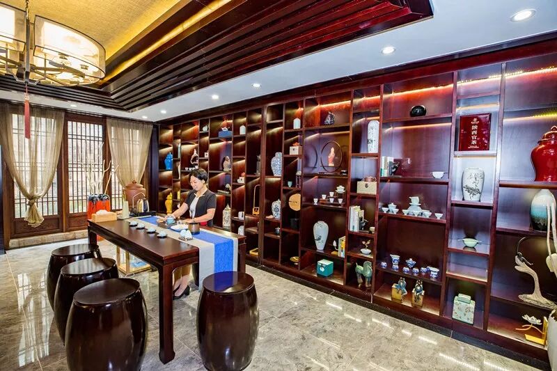 赣商足迹遍布全国,商帮中少不了茶商,哪怕到了现在,江西几乎家家有茶,家家喝茶,所以,我们用江西十大名茶来体现赣文化,这里就是大院的茶艺馆,我们用古法的盖碗茶来泡茶,让客人可以通过盖碗来了解茶文化,安义地表水丰富,以前的商帮从古村经过,烧茶的水就是古井水,因为我们井还在水还在,所以我们延用了这个方法。
