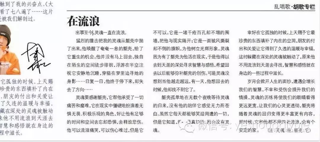 可禁不住经纪人的再三劝说,文章最终被修改,用来纪念官网12周年。只在结尾处,留有一句胡歌自己真正想说的话:"如果我能够变成我想象着的自己,我愿意放下眼前的所有。"于是,为了想象中的自己,胡歌努力做着改变,而文字、话剧和旅行则为他打开了“重生”之门。“除了我自己,没人能让我真正重新站立。如果皮囊难以修复,那就用思想去填满它吧。”2006年10月到2007年2月这半年里,他在《南都娱乐周刊》上发表了十五篇专栏文章;他写下那篇著名的《幸福的拾荒者》,用文字讲述了2006年夏天后自己的心路历程。