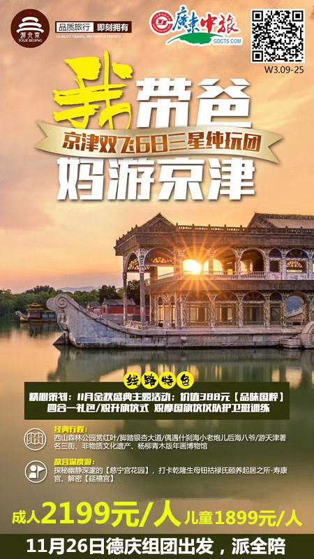 珠海搭乘客机直飞北京/天津(参考时间:07:40-21:30分),如飞天津,前往北京(车程1.30分),抵达北京后,经“国门第一路”进入北京市区。北京是我国的政治、文化中心和国际交往的枢纽,也是一座著名的“历史文化名城”。入住酒店。