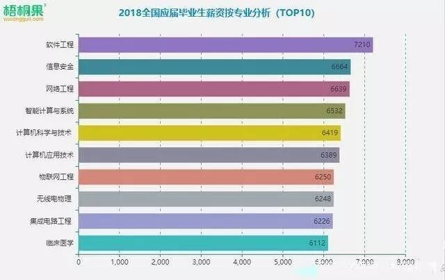 从毕业生高薪专业排行来看,软件工程专业毕业生薪资独占鳌头,平均薪资为7210元;排名第二的为信息安全专业,平均薪资为6664元;网络工程专业平均薪资为6639元,位于第三名。