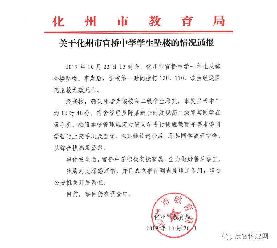 【今日头条】化州官桥中学高二学生坠楼事件,官方通报来了!