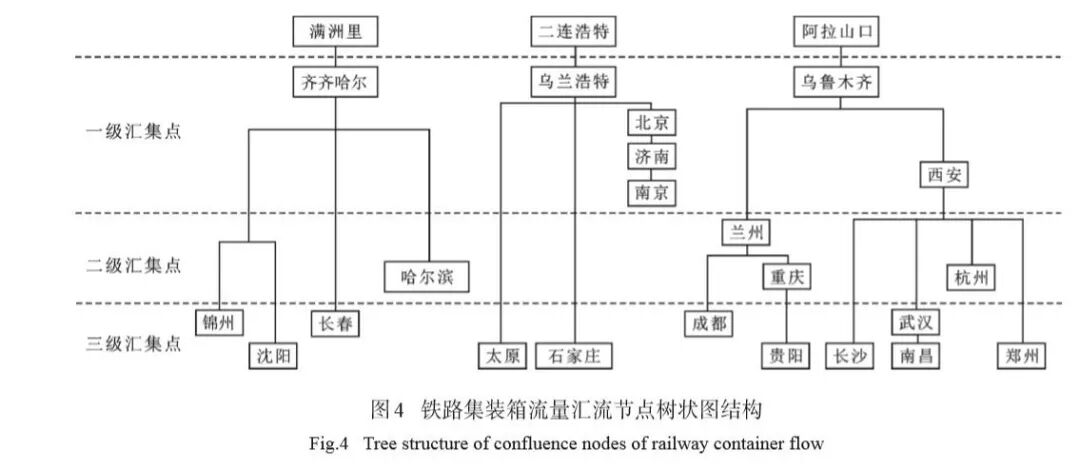 通过对中国中欧潜在集装箱铁路运输流主要运输通道的分析,可以直观地提取汇流节点,将流量汇集的过程抽象为树状图结构。由于城市节点过多,对汇流节点进行筛选,选择集装箱流量较大的节点为运输格局中的关键节点,核算汇集前后的差值,如果自前一个关键节点后再次汇集10亿美元以上的流量,则保留该关键汇集点,否则剔除,继续沿汇集方向寻找下一个汇流节点,从而得到简化的树状图结构(图4)。