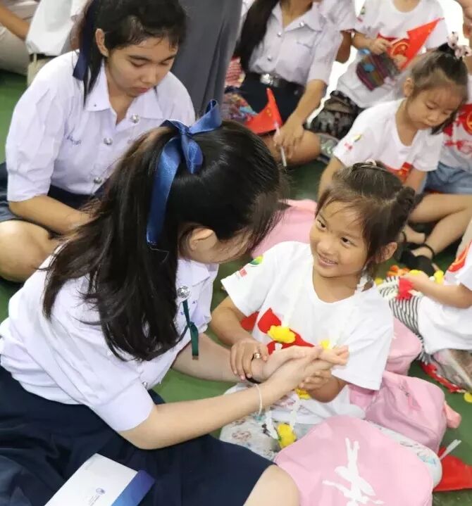 中泰双方的小朋友们互相学习对方的游戏,学习手工艺品,互赠纪念品,缔结国际友谊