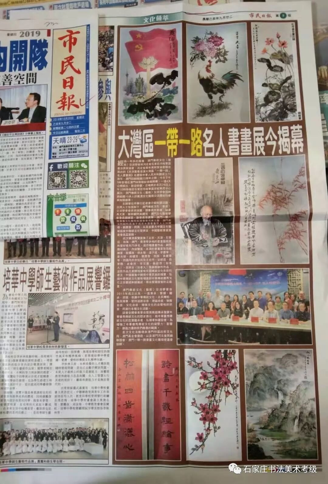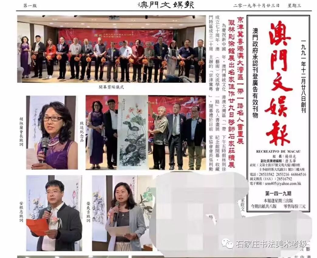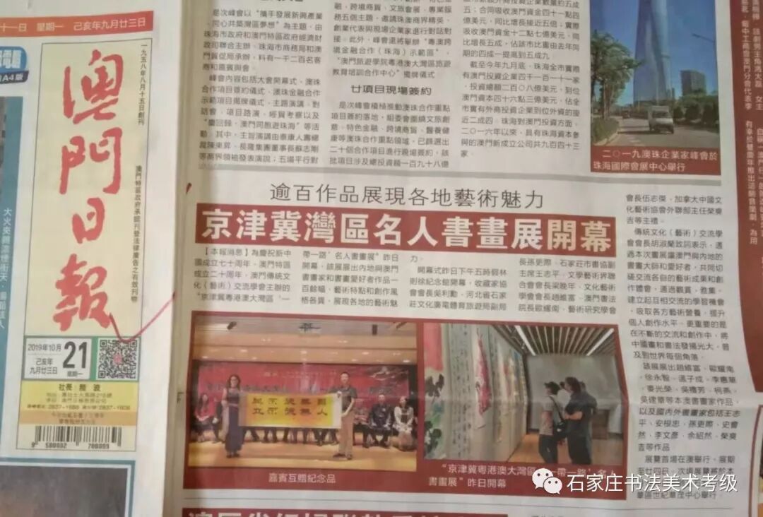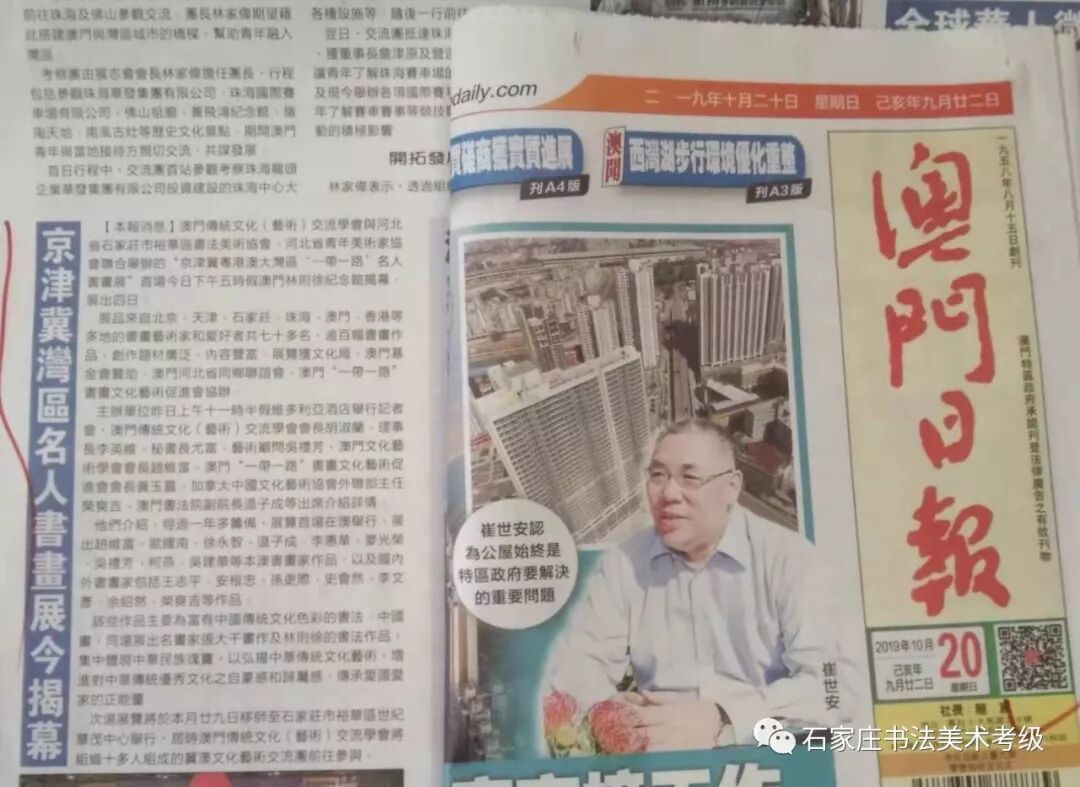 70年风雨兼程、70载光辉岁月。为了庆祝新中国成立70周年暨澳门回归20周年,由石家庄市裕华区书法美术协会、河北省青年美术家协会、澳门传统文化(艺术)交流学会主办,在中共石家庄市裕华区委宣传部、石家庄市裕华区文化广电体育和旅游局、澳门特区政府文化局、澳门基金会的支持下,为庆祝新中国成立70周年暨澳门回归20周年----京津冀粤港澳大湾区“一带一路” 名人书画展暨河北省第五届“天友杯”群众书画展,经过一年多的筹备终于和大家见面了。本次巡展首站澳门,已于2019年10月20日在澳门林则徐纪念馆隆重开幕,展出4天,引起了良好的社会反响,澳门日报、澳门市民日报、华侨报、澳门文娱报等多家媒体进行了连续多日的大幅报道。(文章下方配图)