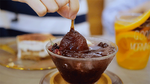 另一道与肉桂有关的——红酒肉桂烩香梨。其实就是圣诞时常常想喝的热红酒,冬天是热的,夏天可做成冰饮。没想到做成冰饮也是别有一番风味,口感清爽很多,肉桂的味道也比较柔和。红酒的酒精挥发掉后,只剩下香香的甜味,第一口喝感觉有点甜,待冰块融化后好喝很多,香梨是去芯的,煮得软软糯糯的,