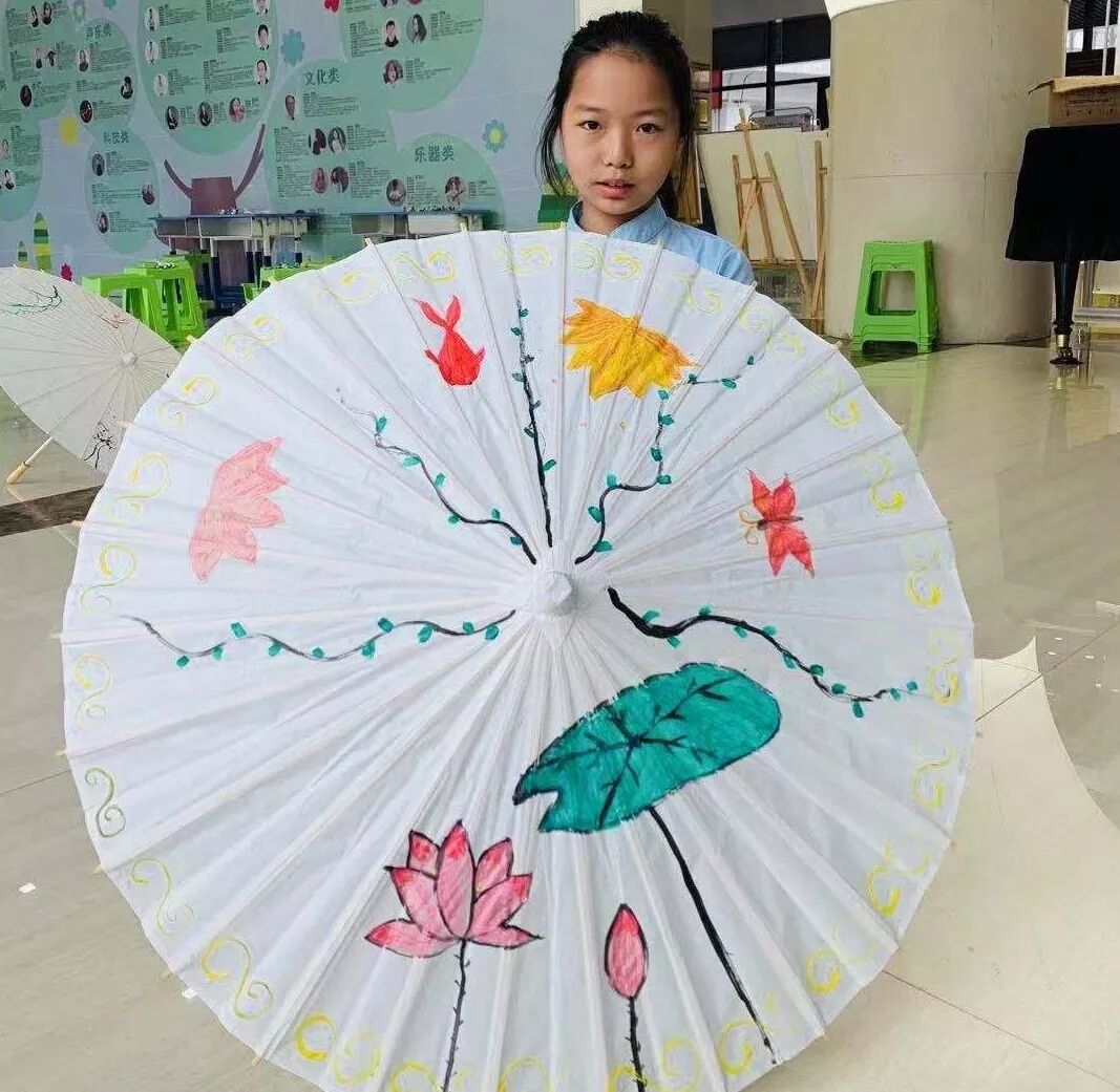 上午,我们进行了美伦美奂的汉服艺术秀。整场活动分为三场。第一场:汉服款式介绍;第二场:传统见面礼仪介绍;第三场:婚嫁习俗礼仪介绍。在欣赏了汉服秀以后,进行了画纸伞的活动,小朋友发挥想象,画梅花、荷叶、燕子,各种传统风景倒映在伞上,别有一番风景。