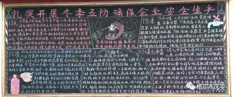 在此基础上,选矿厂开展了以“扎实开展冬季“五防”,确保企业安全生产”为主题的黑板报评比活动。活动由选矿厂综合科牵头组织,各部门(车间)负责人等组成评审组,主要以黑板报标题、版面设计、内容、文字、插图为评分标准进行了评比,营造了浓厚的安全氛围。