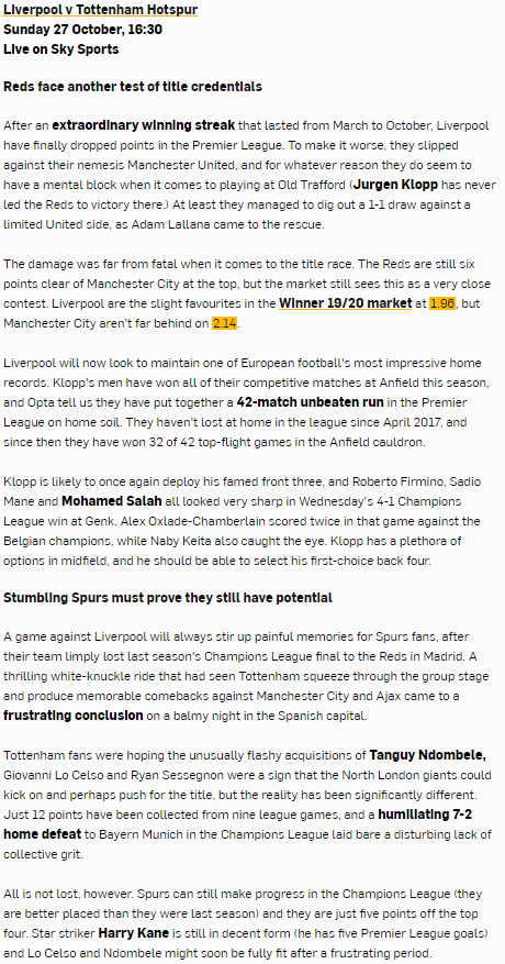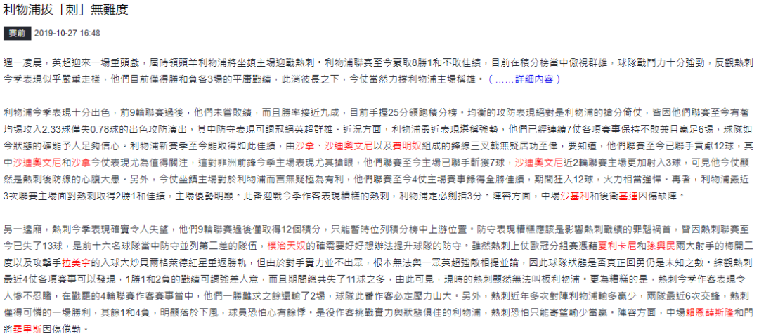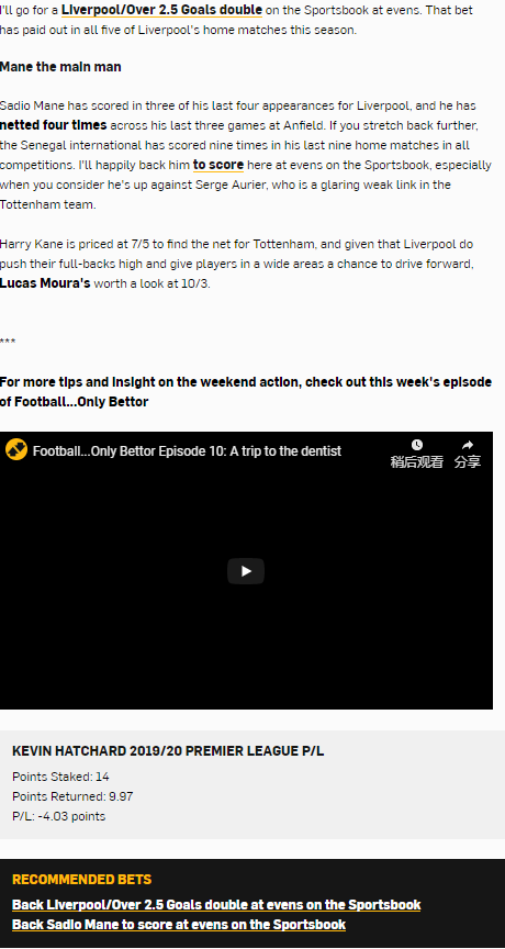点评:英媒某必今天看好利物浦,并认为马内可能进球。经过三月到十月的连胜后,利物浦终于在联赛中丢分了,而且对手还是死敌曼联,这似乎对于士气有所打击。不过从实力来说,利物浦依然是联赛最强球队之一,而热刺方面问题太大了,因此本场比赛,利物浦主胜可以期待。