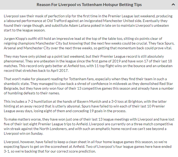 点评:英媒Freesupertips认为利物浦会获胜,并且预测比分为3-1。利物浦本赛季的全胜被终结,如果不是拉拉纳的进球,利物浦可能已经输球了。而热刺方面近期状态奇差无比,同时他们作客安菲尔德的成绩也十分低迷,因此综合来说,主胜的机会不小。