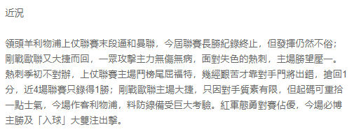 总结:目前欧亚一共4家媒体的意见比较统一,都认为利物浦胜算大。红军本赛季气势极盛,进攻能力强,防守也不错。热刺方面将帅不和,球员人心思变。本来在安菲尔德,热刺就没有优势,本轮比赛,显然他们很难有好果子吃。