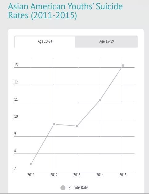 美国国家疾病控制与预防中心的死亡率数据显示,虽然亚洲年轻人的自杀率并不高于全国总体水平,但从2011年到2015年,自杀率逐渐上升。