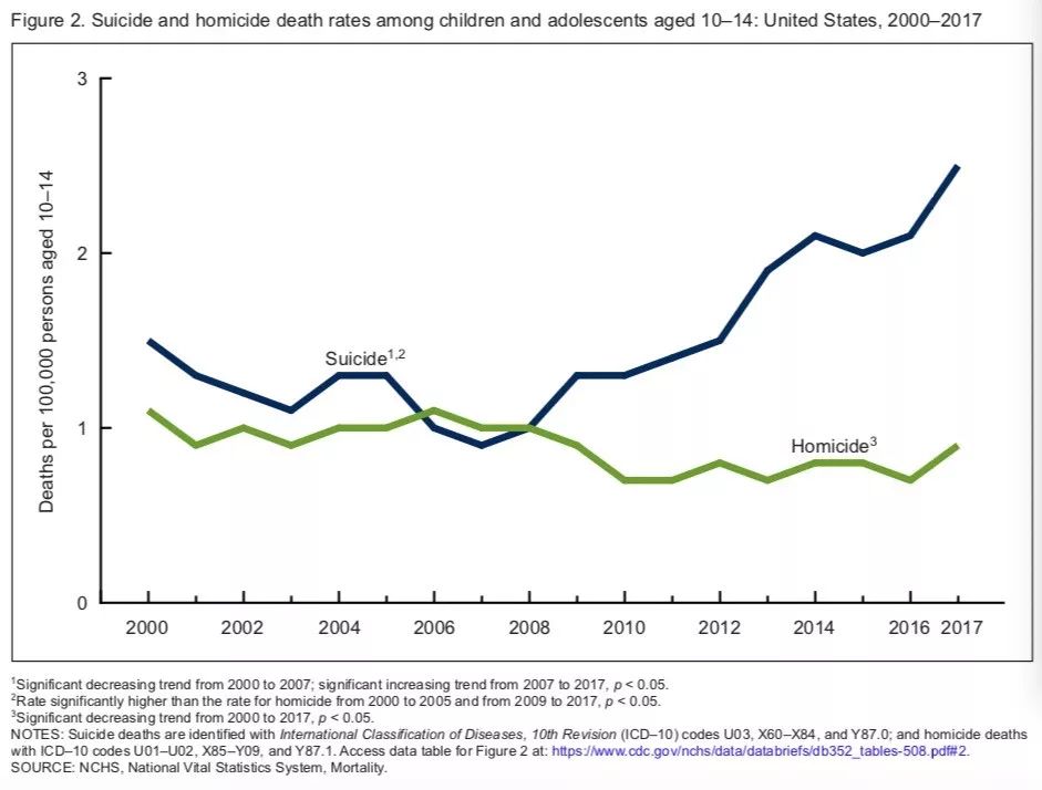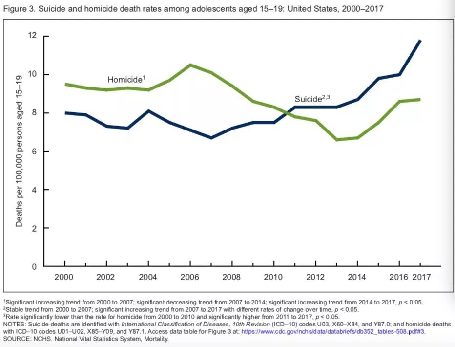 疾病预防控制中心的报告称,在2000年至2007年期间,10-24岁青少年自杀率保持稳定,但在2007年至2017年期间上升了56%。2007年,这些年龄段的自杀率为每10万人6.8人,而2017年的自杀率为每10万人10.6人。