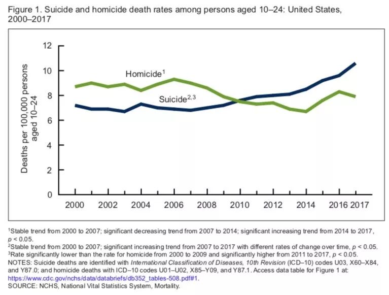 在2000年下半年至2017年期间,10至24岁人群自杀率超过了他杀率,自杀成为第二大死因,仅次于意外事故。此前,死亡的第二大原因是他杀,现在成为第三大死因。