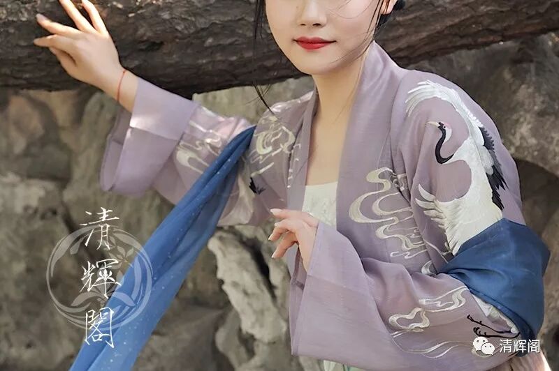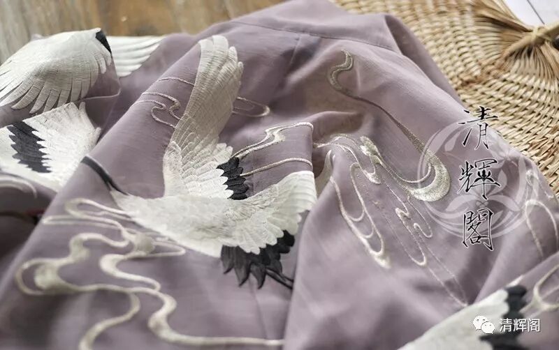 紫霄的设计非常的温婉柔和。低饱和度的灰紫色上襦绣的是经典的仙鹤流云纹样,经过我们改良、优化之后,仙鹤的羽翼显得更加丰厚饱满,流云更加灵动飘逸~~~~~