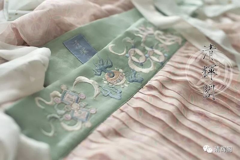 浅绿色的裙腰前后两片均绣有犀角、方胜、如意、蝙蝠等等传统的杂宝纹样,裙身的面料印花则使用的是我们独家设计印染的唐风六边形菱格团花纹样,暖暖的米粉色显得温柔娴静,清新脱俗。