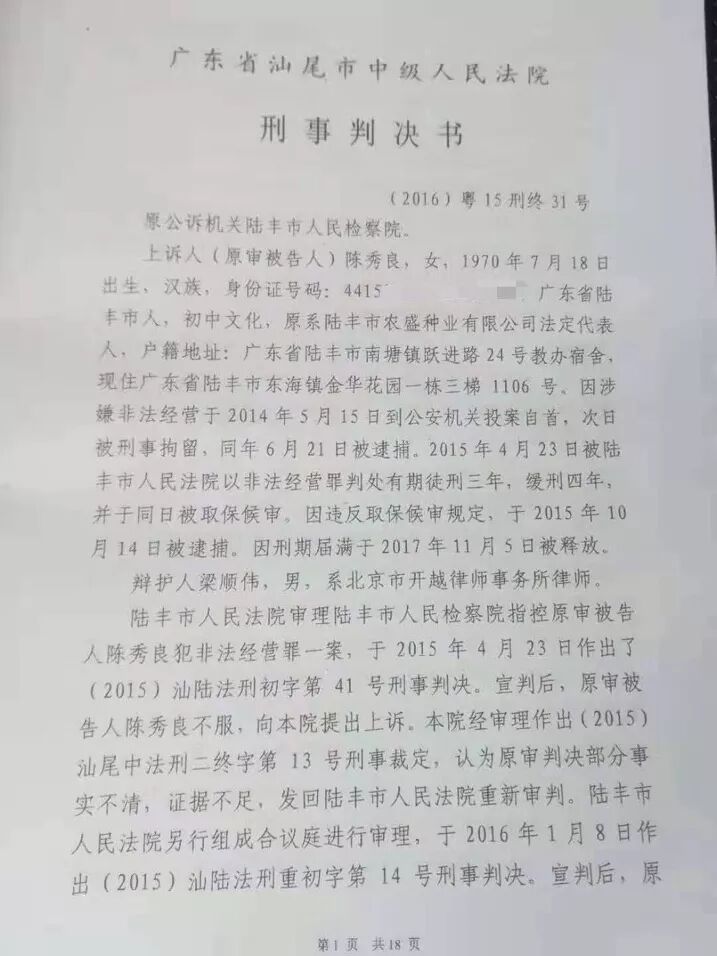 2015年4月23日下午,陆丰人民法院对陆丰市农盛种业有限公司法定代表人陈秀良涉嫌非法经营案作出一审判决:被告人陈秀良犯非法经营罪,判处有期徒刑三年,缓刑四年,并处罚金人民币85万元;2015年4月30日,被告人陈秀良不服一审判决,并向汕尾市中级人民法院上诉;..................................................................................