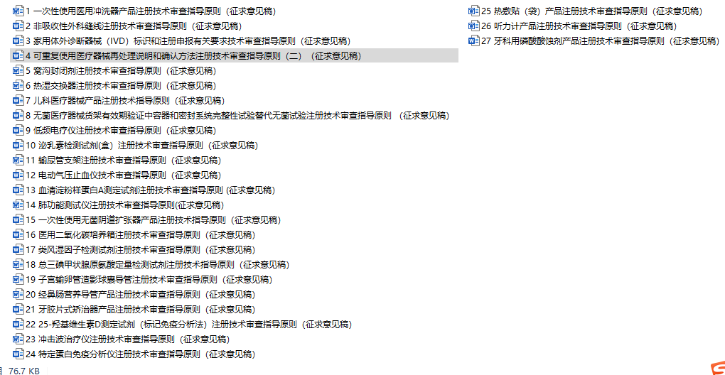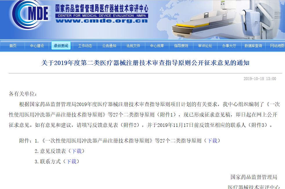 根据国家药品监督管理局2019年度医疗器械注册技术审查指导原则项目计划的有关要求,医疗器械技术审评中心组织编制了《一次性使用医用冲洗器产品注册技术指导原则》等27个二类指导原则(附件1),现已形成征求意见稿,即日起在网上公开征求意见。其中,由天津市医疗器械技术审评中心牵头承担编制的可重复使用医疗器械再处理说明和确认方法注册技术审查指导原则(二)(征求意见稿)顺利发布。