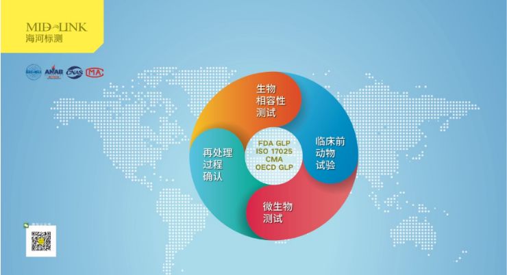 海河标测作为国内领先的第三方独立生物医药(药品、医疗器械、药品包装材料和医疗器械包装材料)检验实验室,于2018年获得CMA资质认定,同时具备CNAS、ANAB认证,并符合FDA GLP(21 CFR Part 58)要求,获授权的承检范围包括生物相容性测试、动物实验、特殊过程确认及微生物测试、ISO18562系列标准等,是中国唯一获得CNAS及CMA资质认定可以进行可重复性使用医疗器械清洗消毒确认的检测机构。