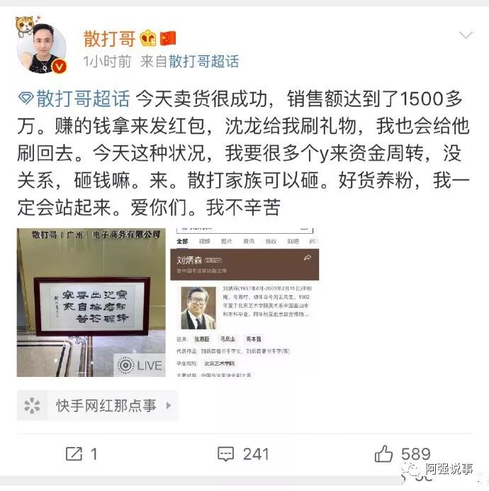 原文:今天卖货很成功,销售额达到了1500多万。赚的钱拿来发红包,沈龙给我刷礼物,我也会给他刷回去。今天这种状况,我要很多个y来资金周转,没关系,砸钱嘛。来。散打家族可以砸。好货养粉,我一定会站起来。爱你们。我不辛苦!