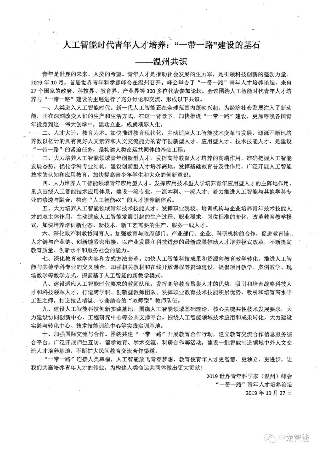 2019年10月27日,世界青年科学家峰会“一带一路”青年人才培养论坛在温州闭幕。受邀参加论坛的27个国家的300余位代表出席闭幕式,并共同发布共识文件:人工智能时代青年人才培养:“一带一路”建设的基石——温州共识。