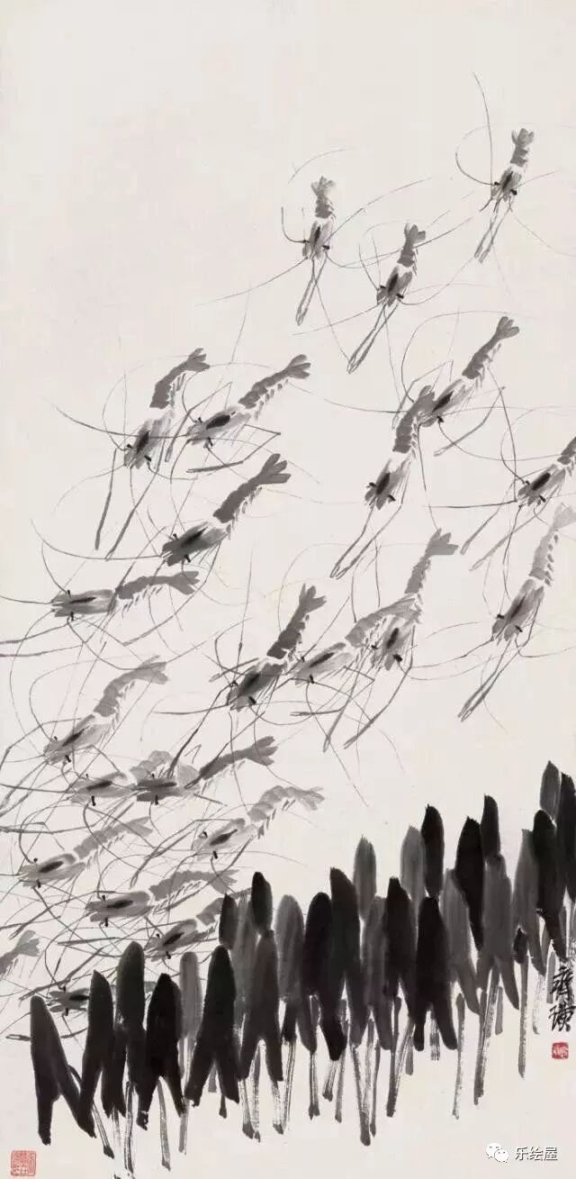 齐白石画虾是画坛一绝,灵动活泼,栩栩如生,神韵充盈,用淡墨掷笔,绘成躯体,浸润之色,更显虾体晶莹剔透之感。以浓墨竖点为睛,横写为脑,以浓墨竖点为睛,横写为脑,落墨成金,笔笔传神。细笔写须、爪、大螯,刚柔并济、凝练传神,显示了画家高妙的书法功力。画家写虾,来自生活,却超越生活,大胆概括简化,更得传神妙笔。
