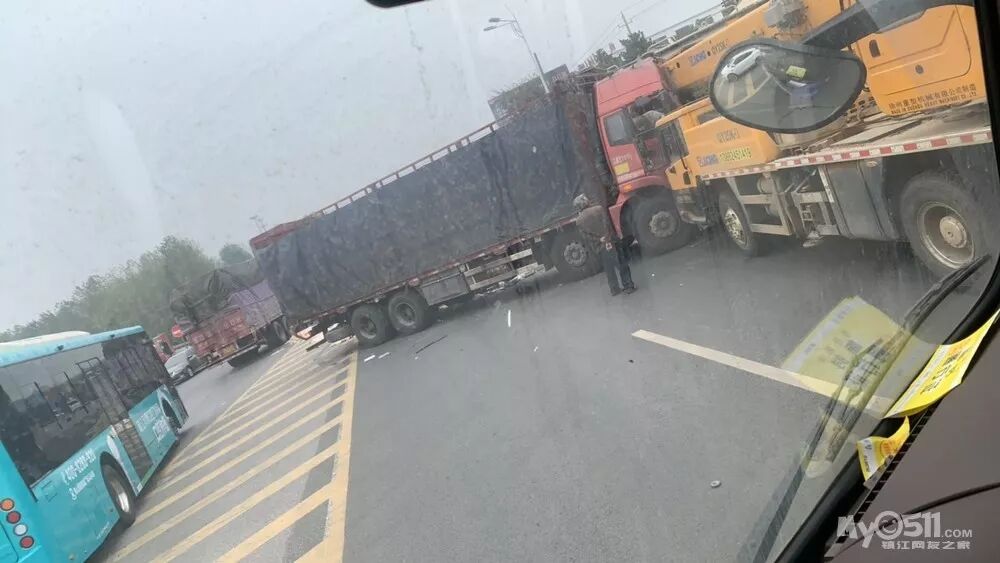 今日中午网友发帖爆料镇江金润大道靠近镇南立交桥发生车祸3辆货车相撞,路过请注意避让!