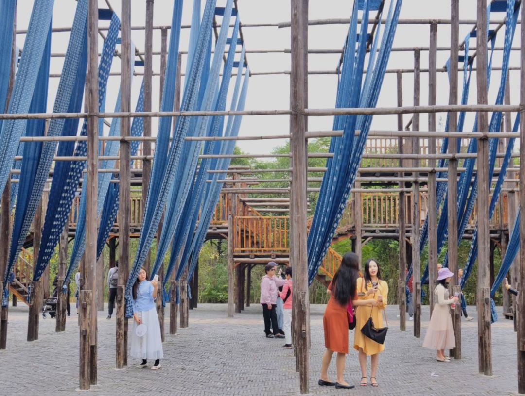 晒场上,蓝白色花布在阳光下很是美好,非遗传统提线木偶妙趣横生,每位大师每只手需提50多条,3米长的细线。山居图上看哪吒闹海,隐居地里看梁祝化蝶,歌声袅袅,引来游人无数。