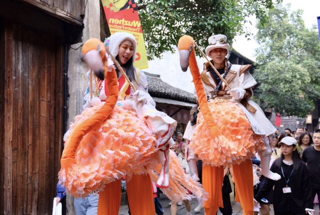 乌镇戏剧节中,有一个“古镇嘉年华”环节,即在乌镇西栅景区内,以木屋、石桥、巷陌甚至摇橹船为舞台,每天近200场演出。