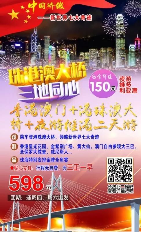 三地同心、登港珠澳大桥——香港、澳门、珠海联游精品二天游1、乘车登港珠澳大桥,领略新世界七大奇迹;