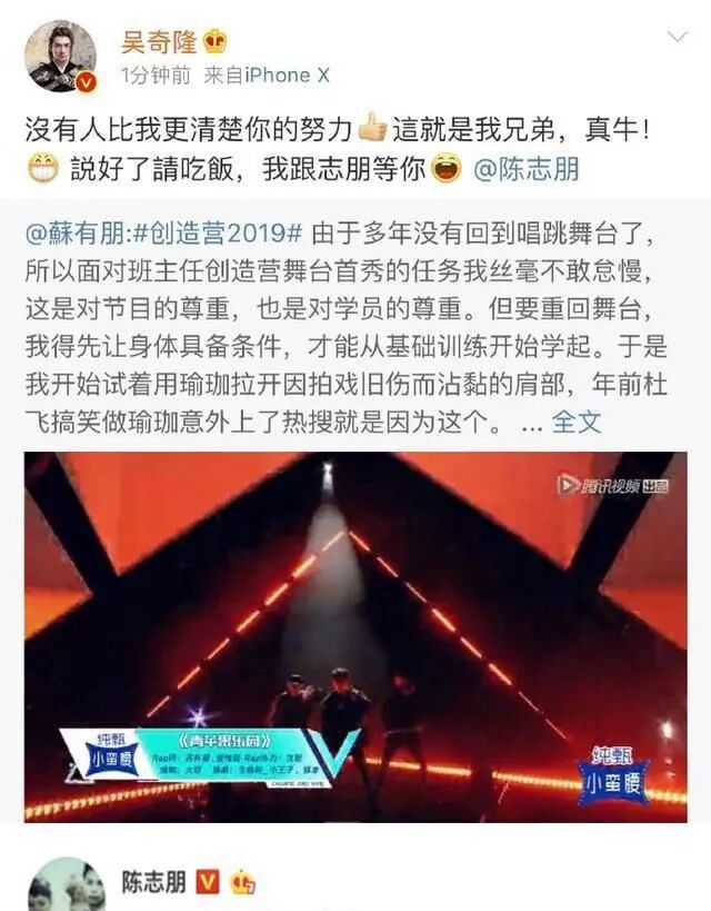 吴奇隆看完第一集《创造营2019》的节目后,就在微博上回应了苏有朋,约定一起吃饭,并大赞了苏有朋在节目中唱跳《青苹果乐园》那一段的表现。另一边忙着走秀的陈志朋也在微博中迅速回应:“别光说不练,赶紧约起来”,并配上了三只小老虎。