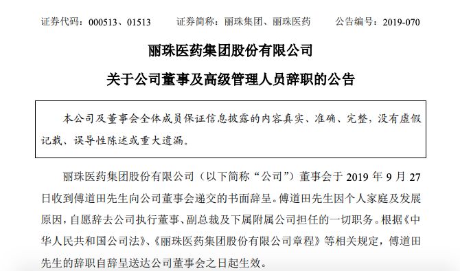 公告显示,丽珠集团董事会于2019年9月27日收到傅道田先生向公司董事会递交的书面辞呈。傅道田先生因个人家庭及发展原因,自愿辞去公司执行董事、副总裁及下属附属公司担任的一切职务。根据《中华人民共和国公司法》、《丽珠医药集团股份有限公司章程》等相关规定,傅道田先生的辞职自辞呈送达公司董事会之日起生效。