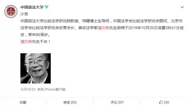 点击上方“人民法治”可以订阅哦!据中国政法大学官方微博,中国政法大学比较法学研究院教授、特聘博士生导师,中国法学会比较法学研究会顾问、北京市法学会比较法学研究会名誉会长、著名法学家潘汉典先生因病于2019年10月26日凌晨5时41分逝世,享年98周岁。