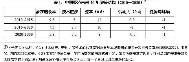 在上述假定下,我们可以估计出中国经济未来的基本增长结构(百分点)如表1。