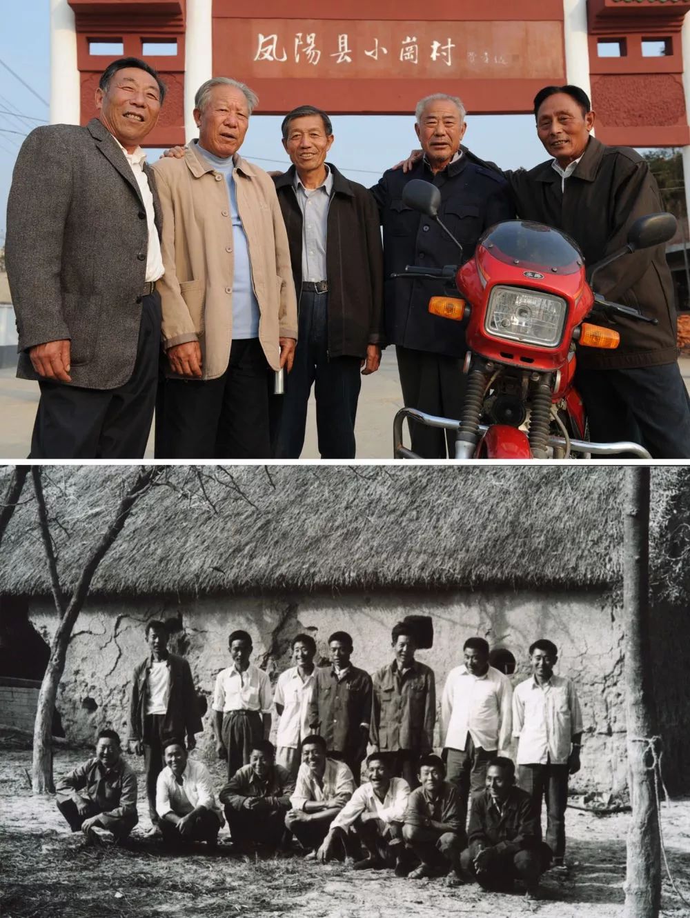 ▲ 上图:当年“大包干”带头人关友江、严俊昌、严金昌、严学昌、关友申(从左至右)在安徽省凤阳县小岗村牌楼前合影(新华社记者王雷2008年10月7日摄)。下图:部分“大包干”带头人在实行农业“大包干”初期在茅草屋农舍前的合影(资料照片)。