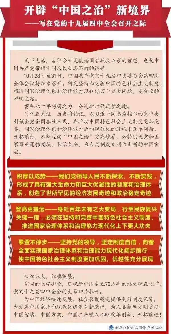 天下大治,古往今来无数治国者孜孜以求的理想,也是中国共产党带领中国人民矢志不渝的追寻。 10月28日至31日,中国共产党第十九届中央委员会第四次全体会议将在京召开。研究坚持和完善中国特色社会主义制度、推进国家治理体系和治理能力现代化若干重大问题,是会议的鲜明主题。 蓄积七十年磅礴之力,奋进新时代筑梦之途。 时代正见证,历史将铭记。以习近平同志为核心的党中央引领全党全国各族人民,在推动中国特色社会主义制度更加完善、国家治理体系和治理能力迈向现代化的进程中改革创新、开拓前行,不断迈向“中国之治”更高境界,必将实现党和国家事业蓬勃发展、长治久安,为人类制度文明作出新的中国贡献。