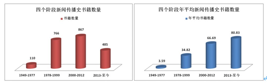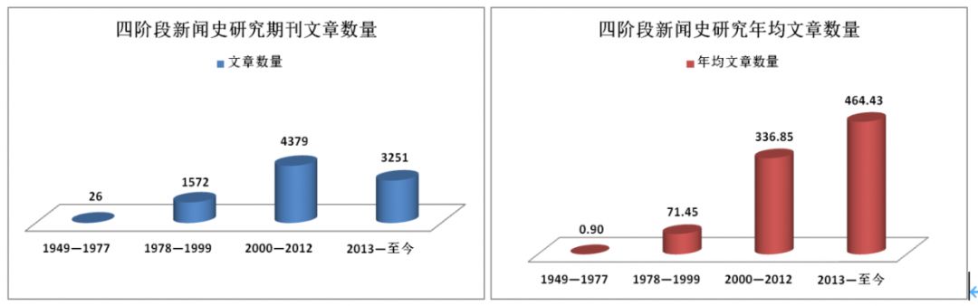 同样,中国的新闻传播史研究四个阶段在《四个阶段新闻史研究期刊文章数量》(见下左图)中,文章数量分别是26、1572、4379、3251篇,而看《四个阶段新闻史平均文章数量》(见下右图),四个阶段的平均数字分别为0. 90、71.45、336.85、464.43, 仍然发现四个阶段的新闻传播史书籍成不断上升趋势,且增长速度越趋强劲。